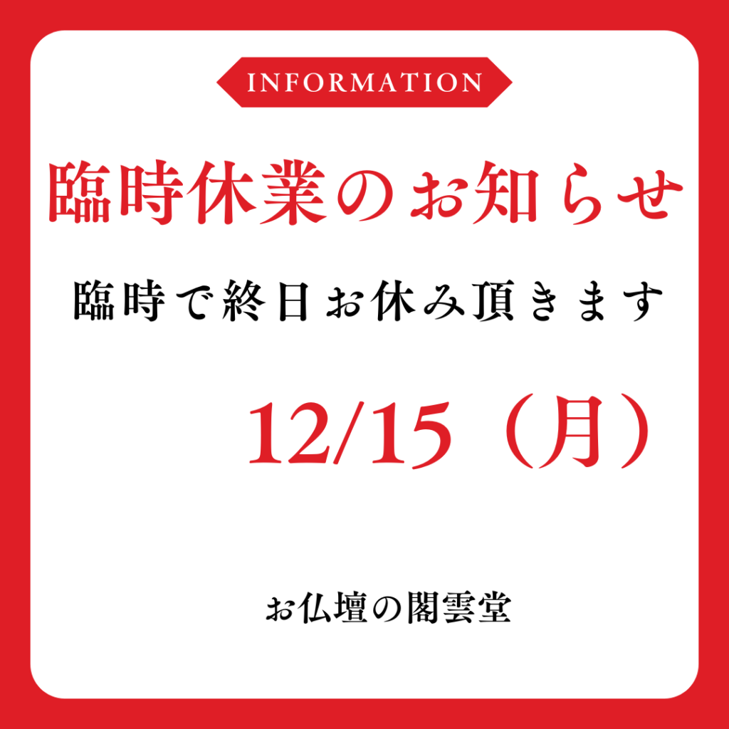 12/15(月)は終日、閣雲堂豊中店、閣雲堂川西店はお休みとさせて頂きます。